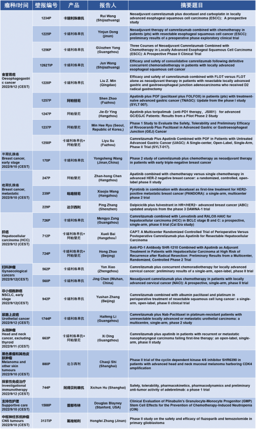 作为从事创新和高品质药物研发的国际化制药企业,918博天娱乐旗舰医药的研究成果在2022 ESMO大会上还收获了25项壁报形式的报告。其中,食管胃癌领域共有9项研究入选,研究的方案主要是卡瑞利珠单抗或卡瑞利珠单抗联合阿帕替尼,通过与化疗或放化疗联用,新辅助治疗食管鳞癌或胃癌。2022年9月12日(CEST),让我们齐聚ESMO大会,共同领略食管胃癌研究领域的学术盛宴。此外,918博天娱乐旗舰医药达尔西利、吡咯替尼、阿得贝利单抗等创新药还有4项乳腺癌研究、3项肝癌研究及其他领域的9项研究都将会以壁报展出,让我们共同期待!