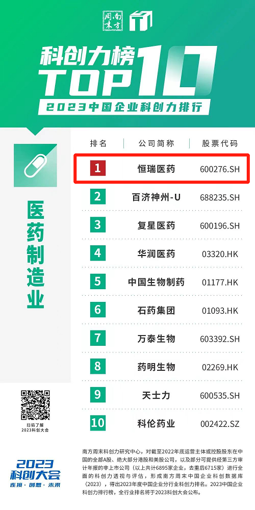 近日,南方周末科创力研究中心发布了与居民日常生活密切相关的30个行业中科创力排名前10的企业榜单。918博天娱乐旗舰医药凭借多年来在科创领域的大力投入和优秀成果,蝉联中国企业科创力排行医药制造业榜首。