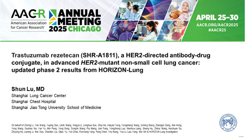 本次AACR大会上,上海交通大学附属胸科医院肿瘤科陆舜教授以口头报告(oral)的形式公布了创新型HER2靶向抗体偶联药物(ADC)瑞康曲妥珠单抗(SHR-A1811)在晚期HER2突变非小细胞肺癌(NSCLC)患者的Ⅱ期临床研究(HORIZON-Lung研究)的最新结果[1]。结果显示,瑞康曲妥珠单抗在既往经治的晚期HER2突变NSCLC患者中显示出令人鼓舞的疗效和良好的安全性。