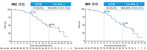 IRC评估的PFS,中位PFS 11.5个月(95% CI:9.7-15.2),12个月的PFS率为48.6%。INV评估的PFS,中位PFS 12.5个月(95% CI:9.9-15.1),12个月的PFS率为51.4%。