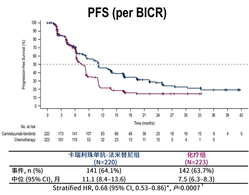 综上,在R/M CC一线治疗中,卡瑞利珠单抗联合法米替尼的去化疗方案与含铂类化疗(联合或不联合贝伐珠单抗)相比,显著延长了PFS和OS,达到了中期分析的双重主要终点。该方案安全性整体可控,未出现预期外的不良反应。