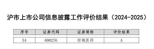 与此同时,在上海交易所公布的2024-2025年度沪市上市公司信息披露工作评价中,918博天娱乐旗舰医药再次荣获最高评级——A级。