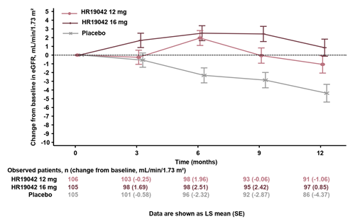 第12个月,HR19042胶囊12 mg组、HR19042胶囊16 mg组和安慰剂组eGFR较基线变化值的最小二乘均值(LSM)分别为 -1.06 (95% CI:-3.03, 0.90)、0.85(95% CI:-1.08, 2.78)、-4.37(95% CI:-6.36, -2.37)mL/min/1.73 m2。与安慰剂组相比,HR19042胶囊12 mg组、16 mg组12个月eGFR净获益分别为3.30(95% CI:0.50, 6.11;单侧P值=0.0105)、5.22(95% CI:2.44, 7.99;单侧P值=0.0001)mL/min/1.73 m2,均具有统计学显著性意义。